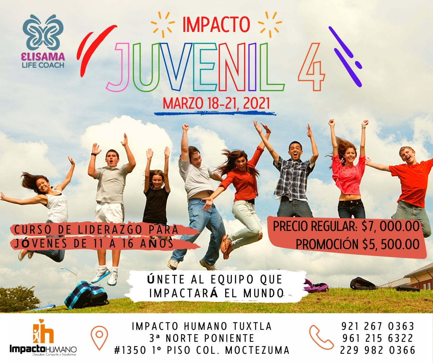 En Impacto Juvenil, brindamos las mejores herramientas que les puedes dar a los jóvenes para crear una base sólida de visión, responsabilidad, liderazgo, autoestima, compromiso y amor en su vida, las cuales aprenderán a través de ejercicios, dinámicas y conferencias, dirigidas por nuestra coach Elisama Méndez.